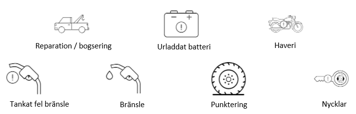 RSA inkluderar assistans på plats, däck/punktering, fel bränsle, bränslebrist, trasig/borttappad nyckel (nyckelhämtning) och urladdat batteri.